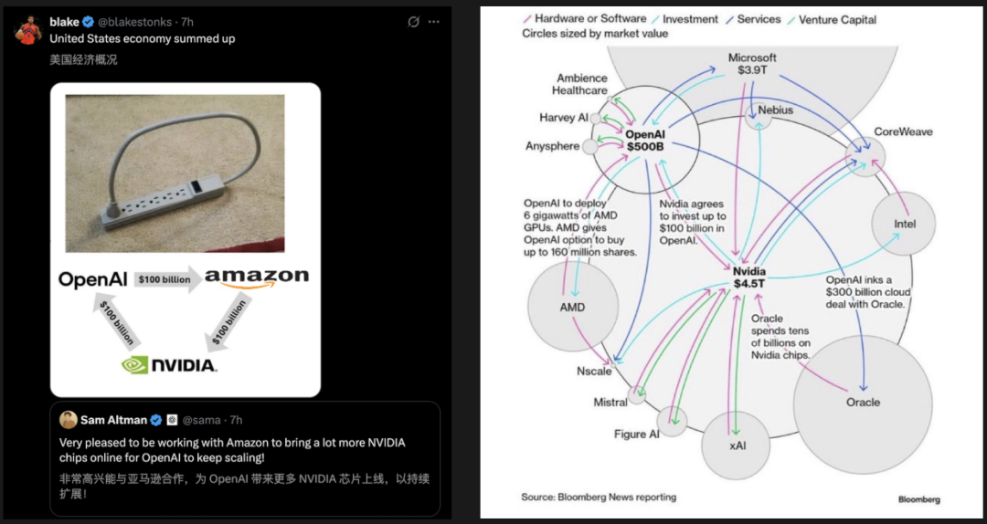 甲骨文、英伟达、亚马逊、微软、AMD、CoreWeave、博通等大厂,皆与OpenAI深度绑定,牵一发而动全身。