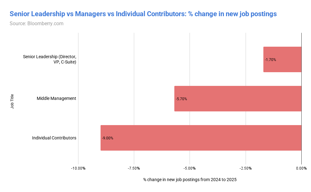 最出人意料的是,尽管整体就业市场萎缩了8%,但高层领导岗位的招聘几乎没有减少。
