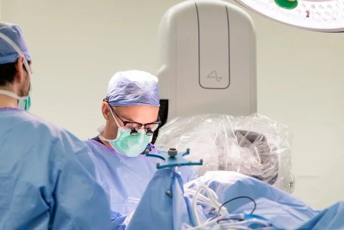 在伦敦大学学院医院的手术室里,医生们围着一台精密的机械臂。
