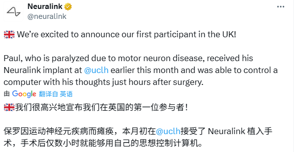 Neuralink在英国的这次芯片植入,属于其国际临床研究计划GB-PRIME的一部分,合作机构包括伦敦大学学院医院与纽卡斯尔医院NHS基金会信托。
