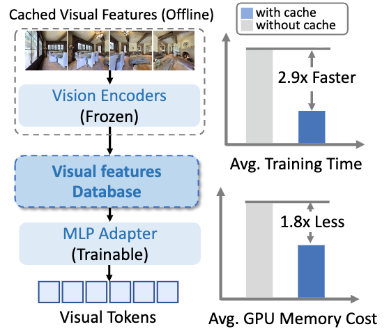 为降低训练对硬件的需求并支持更大规模训练,团队还对图像数据采用了视觉特征缓存(cache)机制,从而显著减少在线计算开销、提升训练效率。