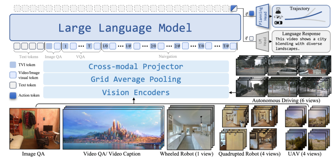 这是全球首个跨本体全域环视导航基座大模型,把Vision-and-Language Navigation、Object-goal Navigation、Visual Tracking 和Autonomous Driving 等不同机器人的导航任务统一到相同的范式。