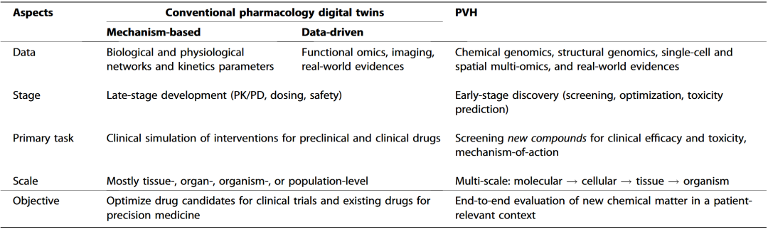 因此,需要一种新型的可编程虚拟人(Programmable Virtual Human, PVH),用于预测未知新分子对人体生理系统的作用,并实现反向设计药物以将疾病表型恢复至健康状态,即使对疾病病因尚未完全理解。表1展示了PVH与传统药理数字孪生在数据来源、建模层次、主要应用阶段与目标等方面的差异。