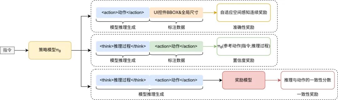 解决了“认知不协调”问题。例如,模型推理“需要点击登录按钮”,却执行了“点击注册按钮”的操作。该奖励模型强制智能体的“思考”与“行动”对齐,这对于复杂任务中的可解释性和故障排查至关重要。