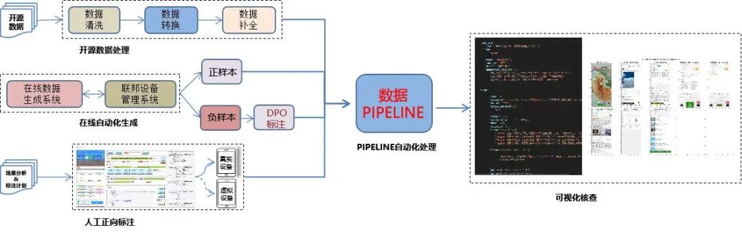 为了让模型精准理解中文GUI界面的复杂结构与语义,中兴针对开源视觉模型严重缺乏中文场景训练数据的问题,整合开源与自研数据,并构建了一套融合XML解析、OCR识别、UI元素检测与大语言模型标注的自动化数据标注流程,显著提升了中文基础数据的构建效率与质量。