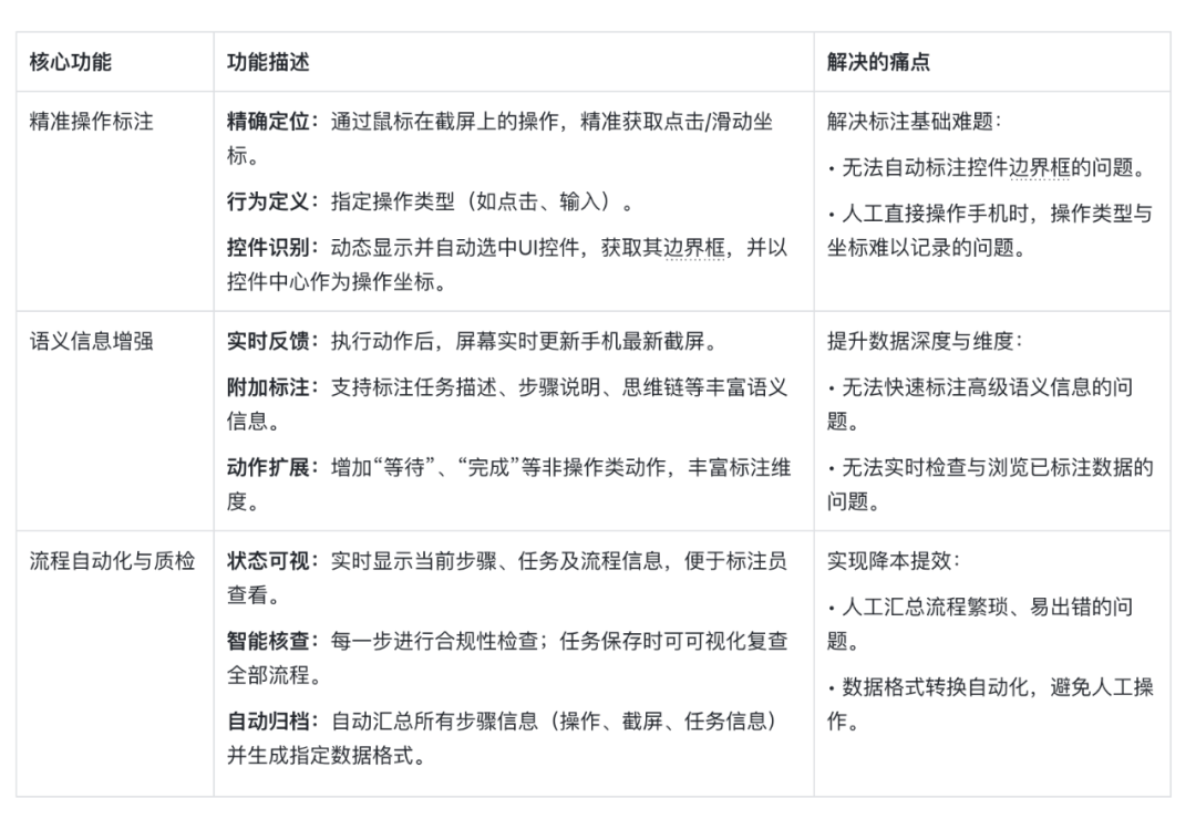 GUI数据标注工具,将原本分散、依赖人工的截屏、操作、标注、核查、归档流程整合为一站式自动化流水线,显著提升了数据标注的效率、精度和丰富度,为模型训练提供了高质量、多维度的高价值数据。