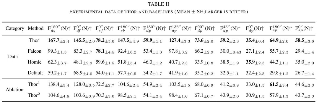 与多种基线方法相比,Thor 在各项力交互任务中均表现出显著优势。例如,在双手向后拉动任务中,Thor 实现了 167.7 N 的峰值拉力(约为机器人自重的 48%),相较于表现最佳的基线算法,性能提升了 68.9%。