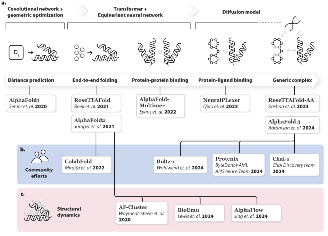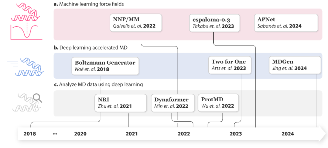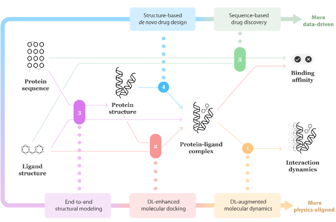 药物发现是一个复杂、资源密集且成功率极低的过程。典型的小分子药物开发通常耗时超过十年,成本高达20–30亿美元。为避免在庞大的化学空间中进行穷举式搜索,理性药物设计(rational drug design)旨在通过对蛋白–配体相互作用的建模,识别能够与特定靶点结合的类药化合物。然而,由于分子间相互作用的复杂性以及传统计算方法的局限性,其实际应用常受制于高计算成本、可扩展性不足及在真实体系中预测精度有限等问题。近年来,深度学习技术的迅猛发展深刻重塑了药物发现的研究范式,AI设计的候选分子在临床I期试验中已展现出显著高于传统方法的成功率。凭借先进的神经网络架构,深度学习能够从大规模数据中自动提取潜在规律与高维表征,从而实现更精确、更高效的蛋白–配体相互作用建模。这一趋势不仅展示了AI在药物发现中的巨大潜力,也凸显出对当前研究进展与未来挑战进行系统性评估的必要性。 近期,北京大学化学与分子工程学院、定量生物学中心、北大-清华生命科学联合中心及北京大学成都前沿生物技术研究院 来鲁华 教授课题组受邀在 Chemical Society Reviews 上发表题为 Modeling protein–ligand interactions for drug discovery in the era of deep learning 的综述论文。来鲁华课题组长期致力于发展基于物理模型与人工智能相结合的小分子、多肽及蛋白质药物设计方法,在多个重大疾病相关靶标上通过计算设计与实验验证获得了可成药性分子并进行了成果转化。本综述系统总结了现代深度学习技术如何与基于物理原理的传统计算方法相辅相成、深度融合并共同推动药物发现进展,回顾了现有方法的代表性应用,深入分析了该领域面临的主要挑战与研究空白,并对未来可能的发展方向进行了展望。 图1 深度学习在蛋白–配体相互作用建模中的典型应用 本综述按照从基于 物理规律 到 数据驱动 的研究范式,系统总结了深度学习在蛋白–配体相互作用建模中的五个相互关联、密切相关的应用方向:(1) 深度学习增强的分子动力学模拟 ,包括更精确且具可扩展性的机器学习力场、基于深度学习的分子动力学采样加速与轨迹建模,以及从动力学轨迹中提取蛋白–配体相互作用规律;(2) 基于深度学习的分子对接、打分与虚拟筛选 ;(3) 端到端的生物体系结构建模 ,包括靶标蛋白结构预测及其在药物设计中的应用、蛋白–配体复合物结构建模以及生物分子构象系综建模;(4) 深度生成模型驱动的基于结构的药物设计 ;(5) 基于序列信息的药物设计 。本综述重点讨论了深度学习在药物设计中的多层次应用,强调基于物理规律与数据驱动两种范式的紧密融合与互补作用,并着重探讨了当前AI药物设计领域所面临的关键挑战、现有方法的局限性及潜在的改进方向。值得一提的是,我们在GitHub上维护了一个相关资源列表(https://github.com/YuzheWangPKU/awesome-protein-ligand-interactions),系统收集和整理了与蛋白-配体相互作用建模相关的论文、基准、数据集与工具,旨在进一步促进AI药物设计领域的发展,并欢迎广大研究者共同参与后续更新与完善。 ——分子动力学模拟—— 图2 结合深度学习与分子动力学模拟的方法 动力学模拟在研究配体结合/解离路径、识别靶标蛋白隐藏口袋、计算结合自由能等方面具有重要的应用,但传统的MD模拟计算成本高、对大体系的可扩展性有限、力场精度仍有待提升。深度学习的兴起为传统MD注入了新的活力,本综述重点关注深度学习与MD模拟结合在蛋白-配体建模中的三方面应用:适用于蛋白-小分子体系的深度学习力场、深度学习加速的轨迹采样与生成,以及基于MD轨迹训练深度学习模型提取蛋白-配体相互作用规律。 适用于小分子的机器学习力场自上世纪90年代起持续发展,进入深度学习时代以来,SchNet、DimeNet、PaiNN、NequiP等一系列深度学习力场进一步提升了精度与计算效率。小分子深度学习力场的发展催生了一系列将混合神经网络势/分子力学(neural network potential/molecular mechanics, NNP/MM)方法应用于蛋白-配体相互作用的MD模拟策略,类似于QM/MM,这些方法使用具有从头算精度的神经网络势建模小分子及关键的相互作用片段、使用传统力场建模蛋白,从而在效率、精度与可扩展性之间取得平衡。近期,GEMS、AI2BMD等深度学习力场将从头算级别的精度扩展至蛋白等生物大分子体系,而AP-Net、espaloma等构建了蛋白-小分子体系的通用深度学习力场,并成功应用于高效准确的结合自由能计算。 传统的MD模拟需要长时间模拟以观察到隐藏口袋打开、配体结合-解离、别构等稀有事件,而深度学习在加速MD采样领域也有着广泛应用。在增强采样(enhanced sampling)、自适应采样(adaptive sampling)领域,基于不确定度的强化动力学(uncertainty-driven reinforced dynamics, RiD)、基于分布外检测(out-of-distribution detection)的过渡态采样等方法有效提高了稀有事件的采样效率。值得关注的是通过代理模型(surrogate models)直接对MD轨迹进行生成式建模的方法,例如早期的Boltzmann Generators和近期MDGen、BioMD等基于扩散模型的方法,本综述在”端到端的生物体系结构建模“一节还将进一步讨论直接生成构象系综的相关进展。尽管多数工作尚未在蛋白–配体场景下进行系统验证,但其潜力值得期待。 基于MD轨迹训练得到的深度学习模型同样有助于更好地理解靶标蛋白的动态信息及蛋白-配体的相互作用