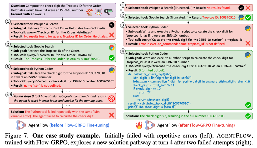 在这个例子中,在经过Flow-GRPO训练前的推理系统,一旦遇到了诸如这里的python变量定义错误,便会反复输出相同的子目标和工具调用,极大地浪费时间和推理效率。