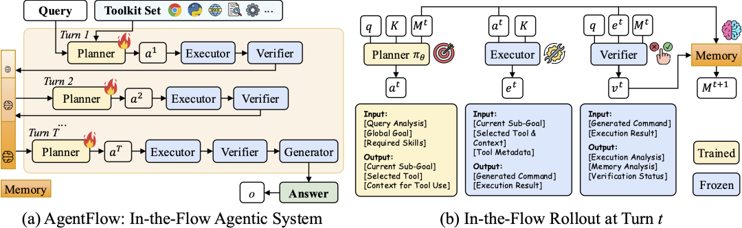 他们提出AgentFlow框架采用模块化架构,通过4个专门化智能体协同工作,配合专门设计的Flow-GRPO算法,使系统能够在真实交互环境中持续优化决策策略。