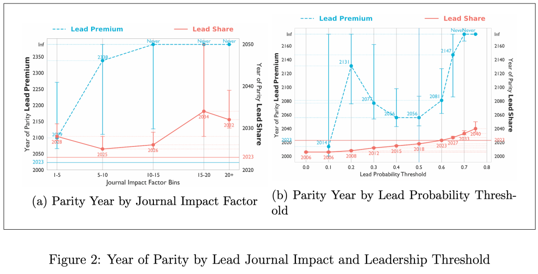 即使将期刊按影响因子分层,中国与美国在高影响力学术期刊上的合作领导权也预计将在2034年前后持平。