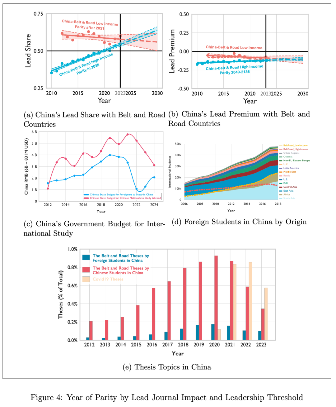 即使面对高收入的「一带一路」国家,中国也在2020年左右达到与对方科研领导力平分秋色的水平。