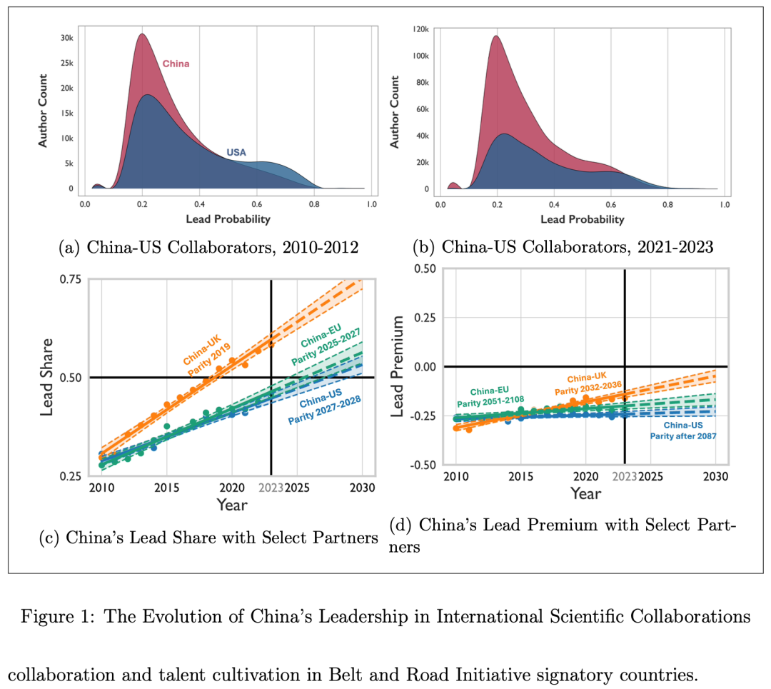 按照研究模型的预测,中国与美国科研合作中的领导者占比有望在2027年前后达到平衡。