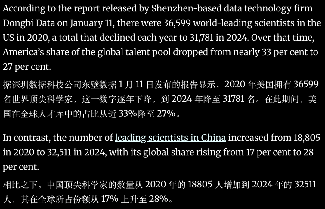 最新发布的一份报告指出,中国拥有的全球顶尖科学家人数已在2024年首度超越美国。