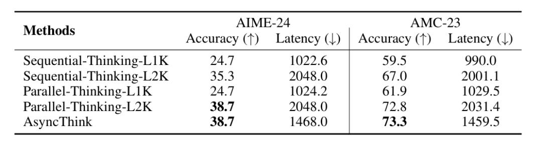 在 AIME-24 上:AsyncThink 的准确率为 38.7%,延迟为 1468.0;在 AMC-23 上:AsyncThink 的准确率为 73.3%,延迟为 1459.5。相较传统并行推理,它在保证精度的同时减少了约 28% 的推理延迟。