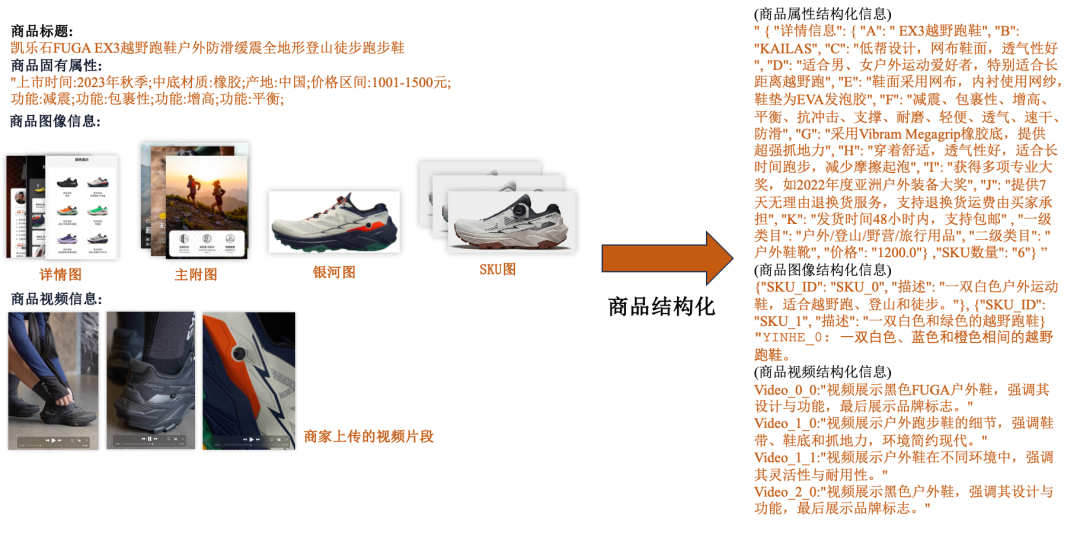 1、商品信息理解:利用商品信息、SKU信息、商详页信息、商品图、主图视频等,充分理解商品核心卖点以及商家的素材内容,构建商品结构化信息。结构化信息包括两个主要模块:完整的商品信息、商品图片/视频素材描述(caption)。