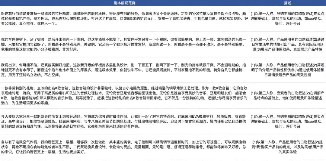 剧本知识库体系通过人设数据库与优质剧本库的双引擎驱动,构建智能化剧本生成解决方案。人设数据库基于多维角色画像实现商品与代言人设的精准匹配,通过人格化信息注入技术塑造立体角色形象,每种人设通过12个维度来刻画;结合检索增强生成(RAG)与上下文学习机制(Context Learning),突破传统LLM仅依赖采样参数调整导致的表层多样性陷阱。相较于传统生成模型千篇一律的语义趋同问题,该系统通过人设特征建模与Context Learning内容生成,在剧本创作中实现创意多样性跃升,有效解决工业化内容生产中同质化严重、情感共鸣不足的核心痛点。入库的剧本均会经过人工校验、以及优惠信息脱敏等处理。部分示例如下:
