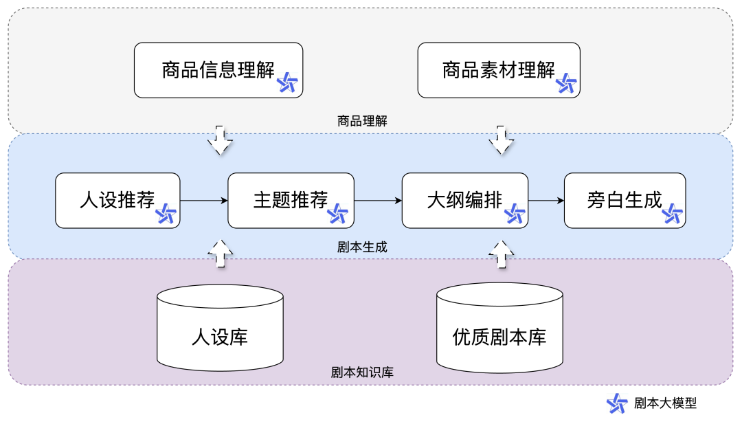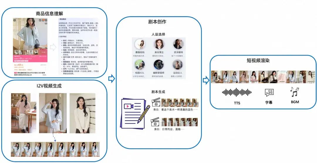 剧本创作以剧本大模型为核心,形成"商品理解-知识支撑-内容生成"三阶闭环:商品理解层依托多模态大模型技术挖掘商品属性卖点与视频素材数据,构建多维度商品特征体系,为内容生产输送精准物料;剧本知识层整合人设特征库与优质剧本模板,通过结构化知识注入实现内容多样性倍增与创作可控性强化;最终生成层融合商品特征与剧本知识,输出兼具情感共鸣与商业价值的创意剧本。该架构通过知识增强机制突破传统AI创作的表达单一性,使内容深度与用户共情力实现双重跃升。