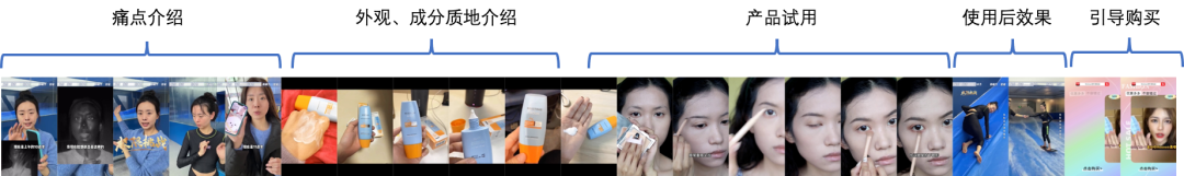 为了给视频生成提供丰富的素材,我们将商家的全部原始视频拆解为单一语义片段,作为视频生成的候选镜头。拆分方案为:利用自研BEM&REM模型对视频片段拆分、打标,同时分析画面的分镜以及片段内文本的完整度,保证拆分后的视频片段内容的一致且完整。配合使用镜头切分和文本内容分析算法,实现了视频内容的片段拆解。比如一段典型电商视频的打标为: