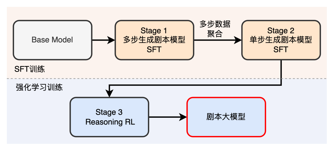 整体训练流程分成两个阶段,第一阶段先做SFT训练,让模型有基本的剧本生成能力;第二阶段通过强化学习来进一步优化生成剧本的质量。