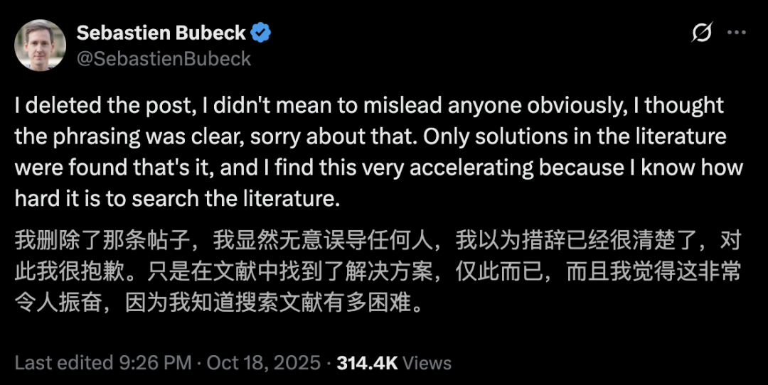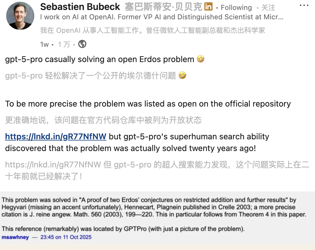潜台词是说,GPT-5过去找到的10个已有解答,并非易事。
