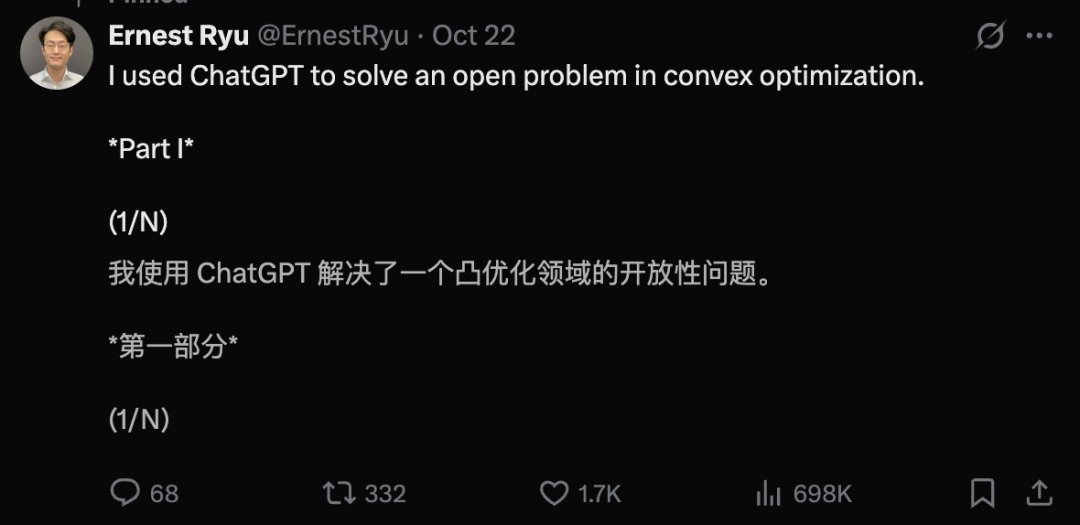 此外,UCLA的数学教授Ernest Ryu,借助GPT-5 Pro解决了一个凸优化领域的开放问题。