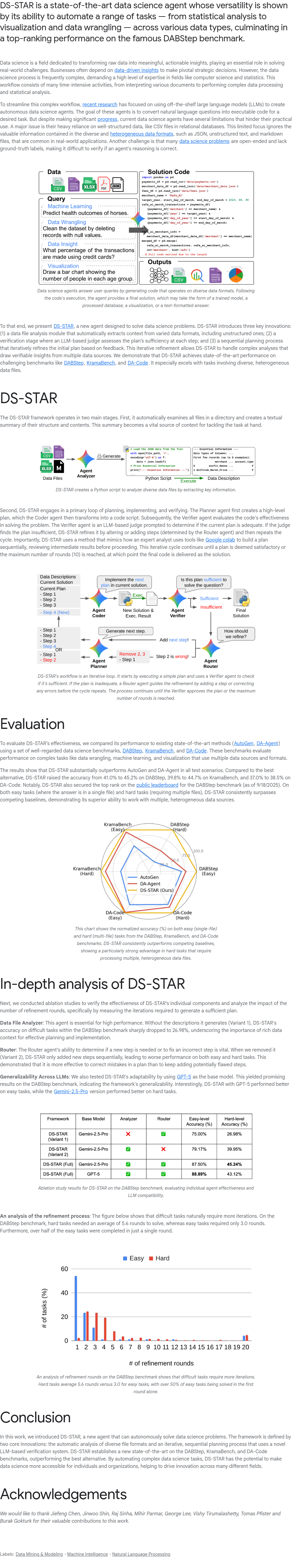 DS-STAR 是一种先进的数据科学智能体,能够自动化执行统计分析、数据可视化和数据清洗等多种任务,适用于多种数据类型,并在著名的 DABStep 基准测试中表现优异。数据科学旨在将原始数据转化为有价值的洞察,广泛应用于企业战略决策,但其流程复杂且耗时,需深厚的专业知识。为简化这一过程,最新研究利用现成的大语言模型(LLMs)开发自主数据科学代理,以提升效率与可及性。