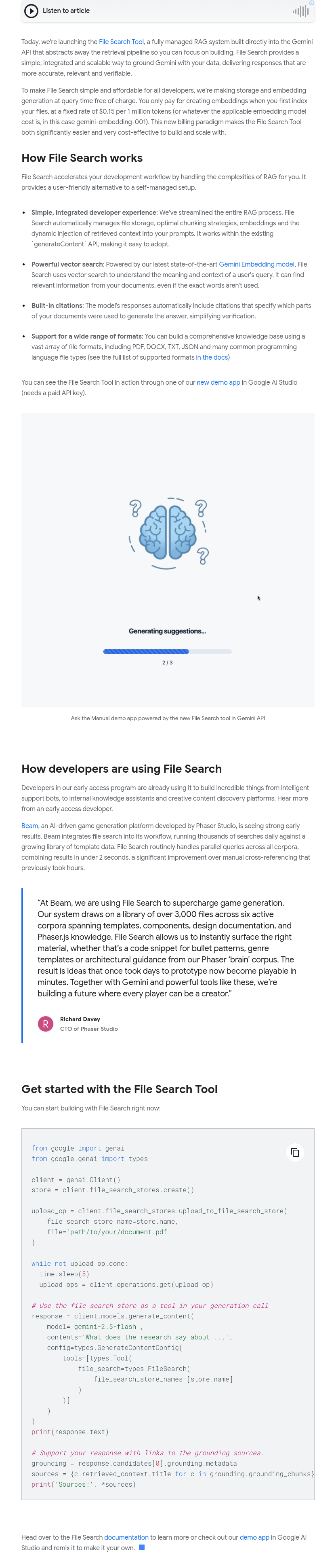 Gemini推出文件搜索工具,一项内置在Gemini API中的全托管RAG系统,简化检索流程,帮助开发者更专注于应用构建。该工具通过将数据与Gemini模型结合,提升回答的准确性、相关性和可验证性。为降低使用门槛,文件存储和查询时的嵌入生成完全免费,仅在首次索引文件时按固定费率收费(每百万token 0.15美元,基于gemini-embedding-001模型)。这一计费模式显著提升了成本效益。文件搜索工具自动处理RAG复杂性,提供简单、集成且可扩展的解决方案,替代繁琐的自建系统,加速开发进程。
