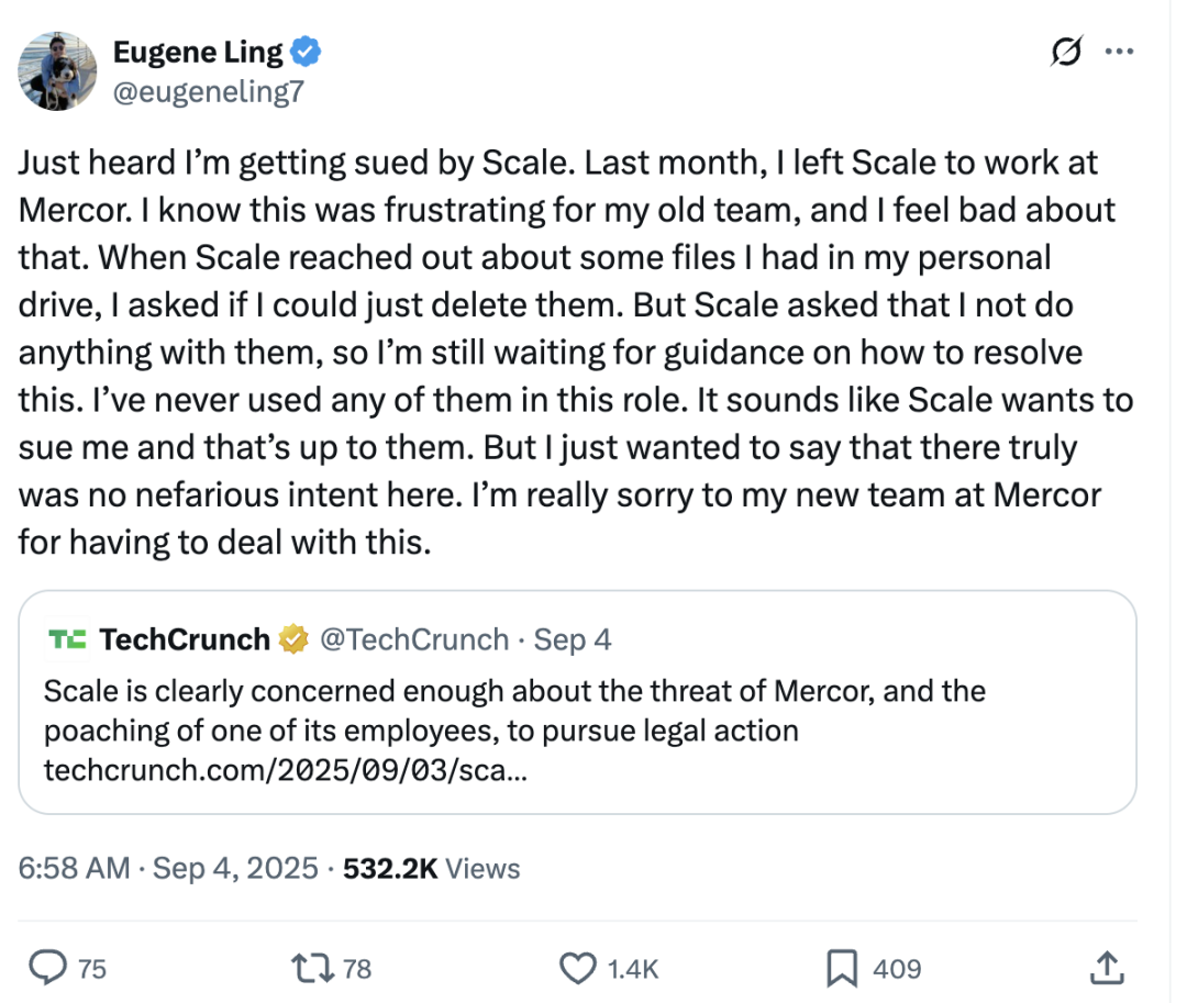 2025 年 9 月,Mercor 面临了一场意想不到的法律纷争。Scale AI 向旧金山联邦法院提起诉讼,指控前员工 Eugene Ling 在离职后将公司商业机密带入 Mercor,包括客户策略、定价模型及内部流程文件,试图利用这些信息拓展与 Scale 客户的合作。Mercor 方面则回应称未曾访问相关文件,并已主动联系 Scale 寻求沟通与解决方案。这起案件在硅谷引发广泛关注。
