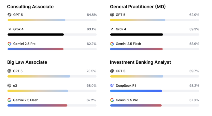 在 APEX v1.0 的测试中,GPT-5 获得了最高分 64.2%,而性能最佳的开源模型 Qwen3 以 59.8% 的得分排名第七。得分最高的是法律领域(70.5%),得分最低的是投资银行领域(59.7%)。