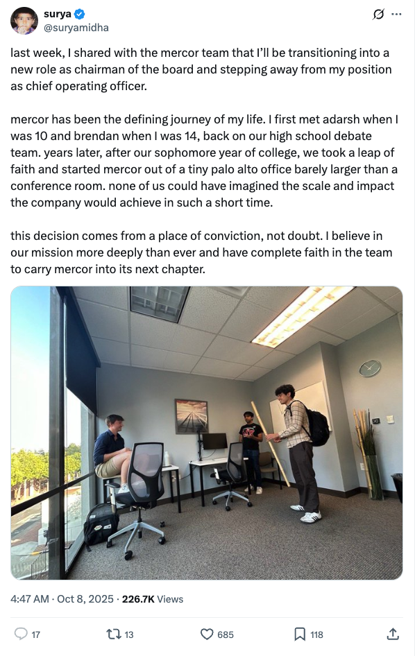 紧接着今年 10 月,Mercor 又迎来了内部团队的重大变动——创始人之一、首席运营官 Surya Midha 在 X 平台宣布卸任首席运营官一职位,转任董事会主席。这一消息让投资者和业内观察者再次聚焦 Mercor 的管理层稳定性及未来发展战略,这一年轻团队的创始人个人规划、公司治理与长远布局仍是行业关注的焦点。