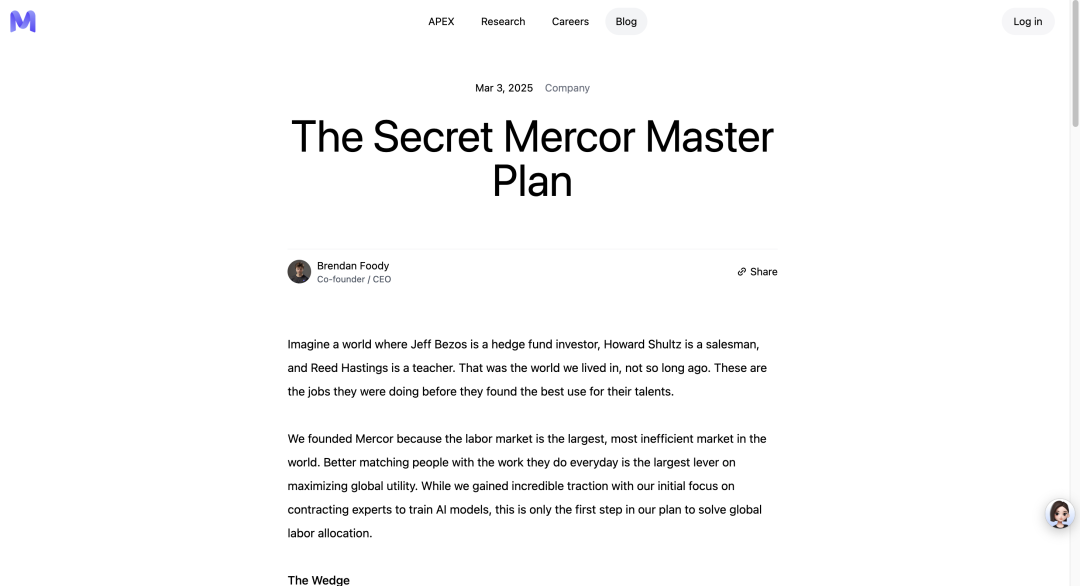 Mercor 的一篇博客文章指出:「如果招聘的是五年期员工,人工面试会更容易。但如果是五周期员工,高效的匹配自动化系统就能带来巨大的竞争优势。因此,我们先从短期合同工做起,随着技术的成熟,我们会逐步扩展到长期全职工作。」