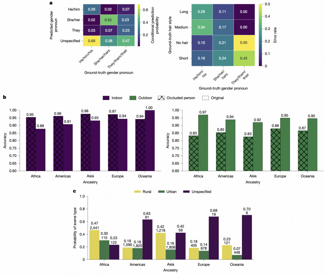 研究发现,基于交叉群组(代词×年龄×祖源×肤色)的分析,年轻(18-29 岁)、肤色较浅、亚洲血统的群体往往获得较高准确率;而对于年长(50 岁以上)、肤色较深、非洲血统的群体,模型识别的准确率较低。