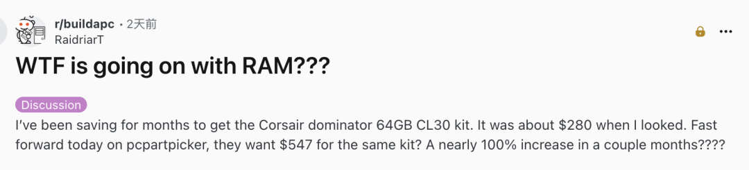 Reddit上有网友吐槽,自己攒了几个月的钱想买的内存,一看价格竟然几乎翻倍。