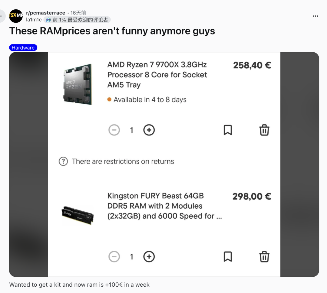 比如金士顿一套64GB的DDR5内存,一周涨了100欧元(50%),涨价后比9700X CPU价格还高。