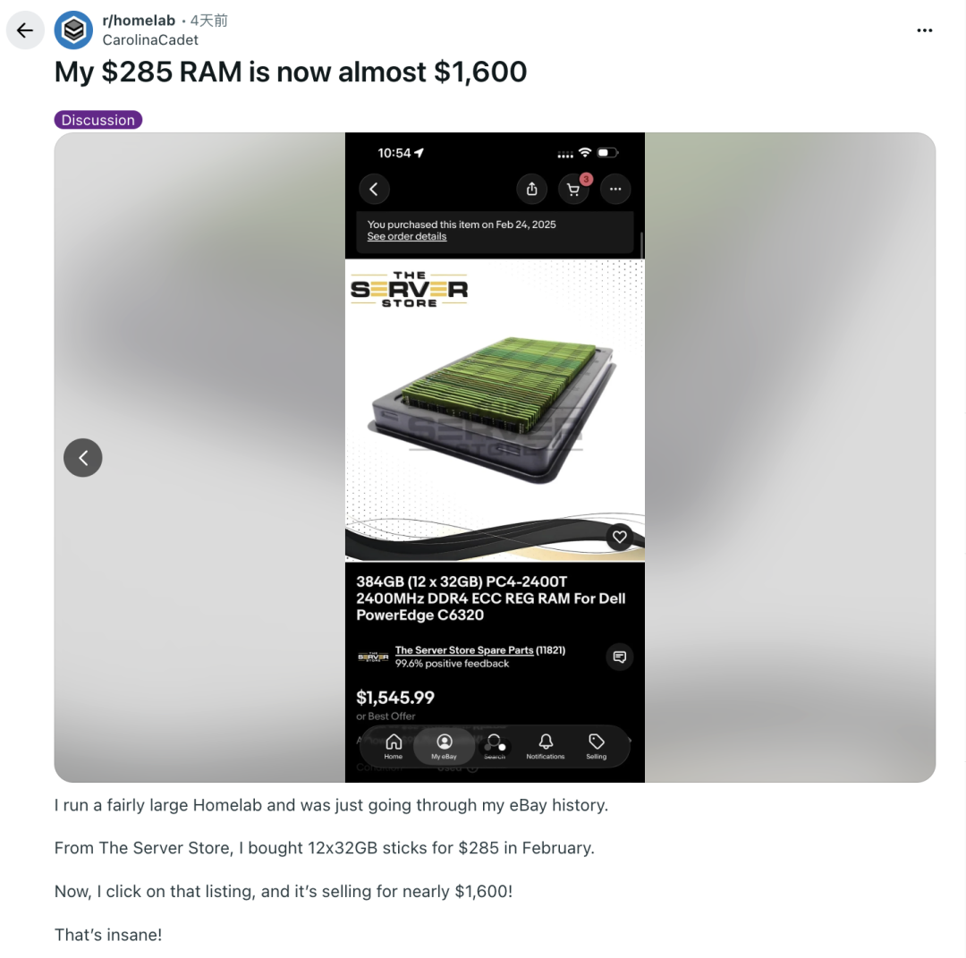 个人之间的交易涨价更加离谱,有网友表示自己花285美元在eBay买的的内存套组,现在价格接近1600美元,相当于涨了4倍多。