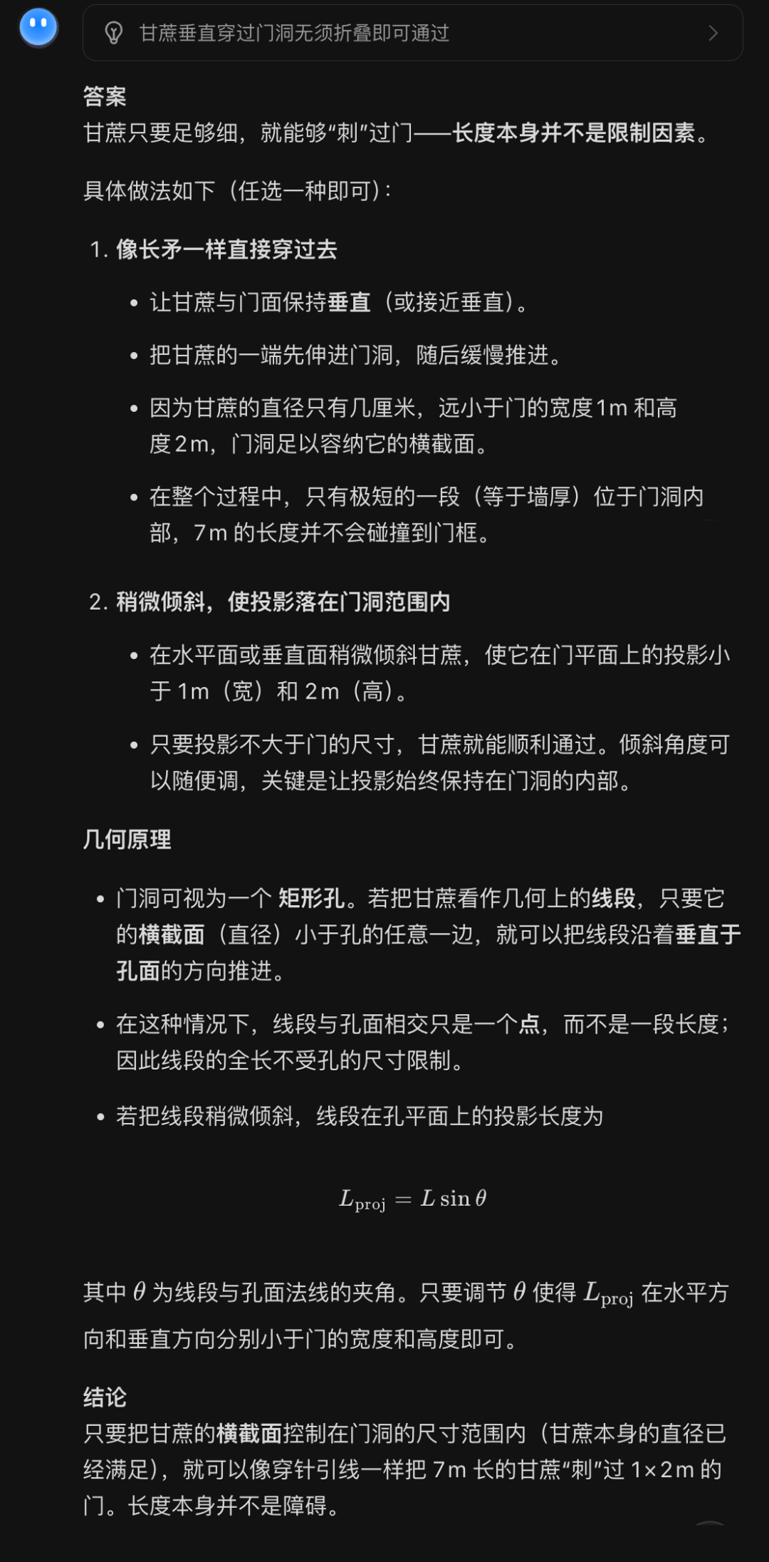 思考的时间是有点长,但Kimi K2 Thinking成功绕过了这道题目中的陷阱,想到了门的长宽其实并不会限制甘蔗的通过。
