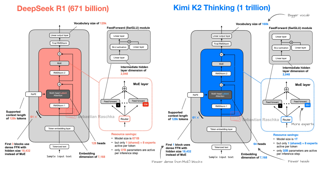 △与DeepSeek R1的架构对比,图源x@rasbt