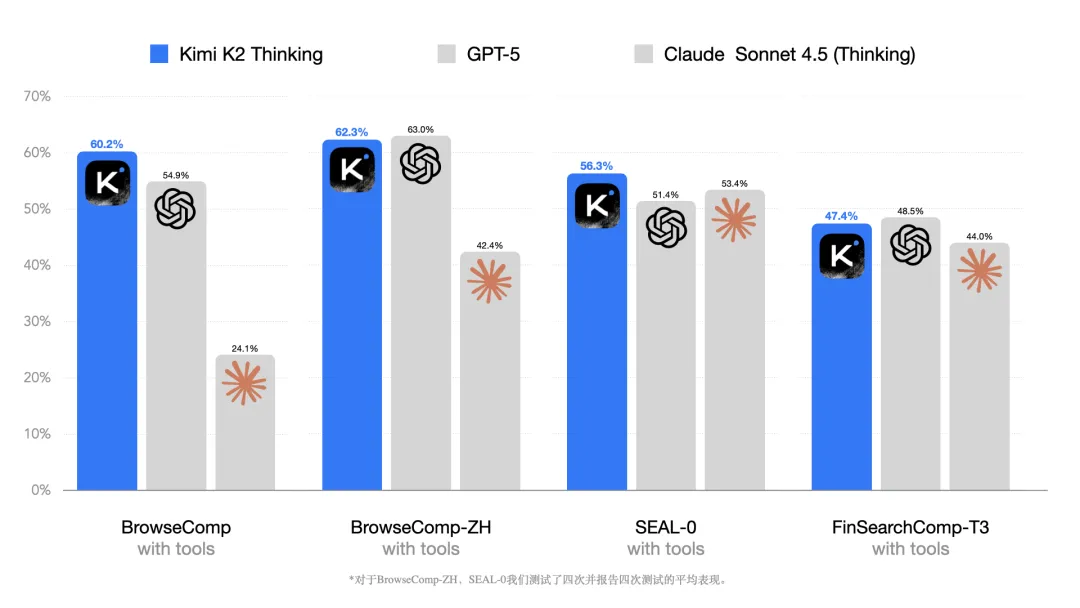 在人类最后的考试(HLE)、测试自主网络浏览能力的BrowseComp,和复杂信息收集推理基准测试SEAL-0等评测基准中,Kimi K2 Thinking都刷新了SOTA,超越GPT-5、Claude Sonnet 4.5(Thinking)等闭源模型。