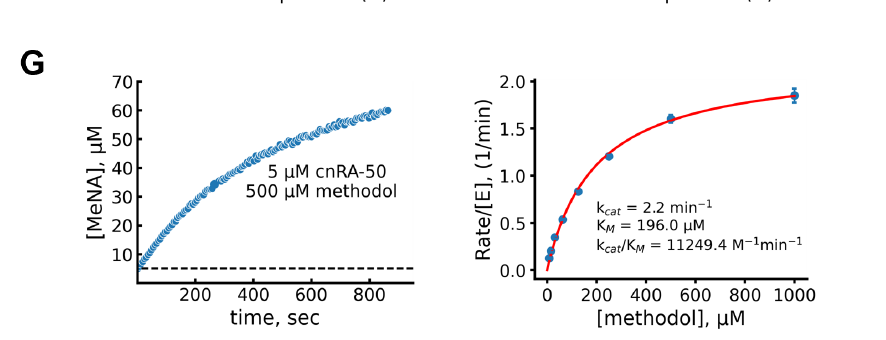 进一步,团队基于 NTF2-like 折叠设计了一轮新的逆醛酶,通过 PLACER 评估预组织程度与 kcat/KM 值的相关性。结果显示,PLACER 预测高度预组织的设计通常具有更高催化效率,其中最活跃的设计 cnRA-50 的 kcat/KM 达到 11,000 M⁻¹min⁻¹,远高于早期计算设计水平,并接近最新 RFdiffusion 和 proteinMPNN 方法设计的活性。