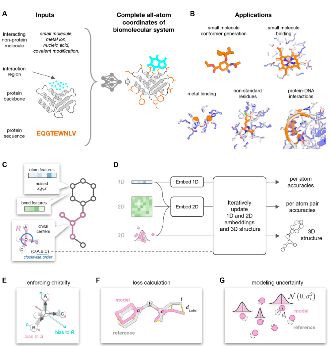 在输入阶段,分子体系被转换为一个化学图(chemical graph),其中节点代表各个重原子(为降低计算成本不建模氢原子),边代表原子之间的化学键(见上图 C)。这一表示方式在不同类型分子间是统一的。网络中每个节点包含原子类型信息及其初始被扰乱的三维坐标。网络的任务是迭代去噪输入坐标,同时估计输出模型结构中原子位置的不确定性(见上图 D)。