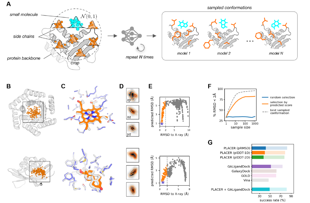 研究人员使用 PLACER 生成目标蛋白口袋中小分子构象集合(下图 A),方法是多次运行网络,每次对输入坐标进行不同随机初始化。分析生成的构象集合表明,PLACER 对配体的初始位置不敏感:多个不同的起始位置都能产生接近天然构象的预测(下图 B),且这些位置覆盖了输入采样的整个空间(下图 D)。研究人员还观察到,基于配体原子计算的预测 RMSD 分数(pRMSD)可用于从采样池中选择更精确的模型(下图 E),评分最高的模型与实验结构高度吻合(下图 C)。