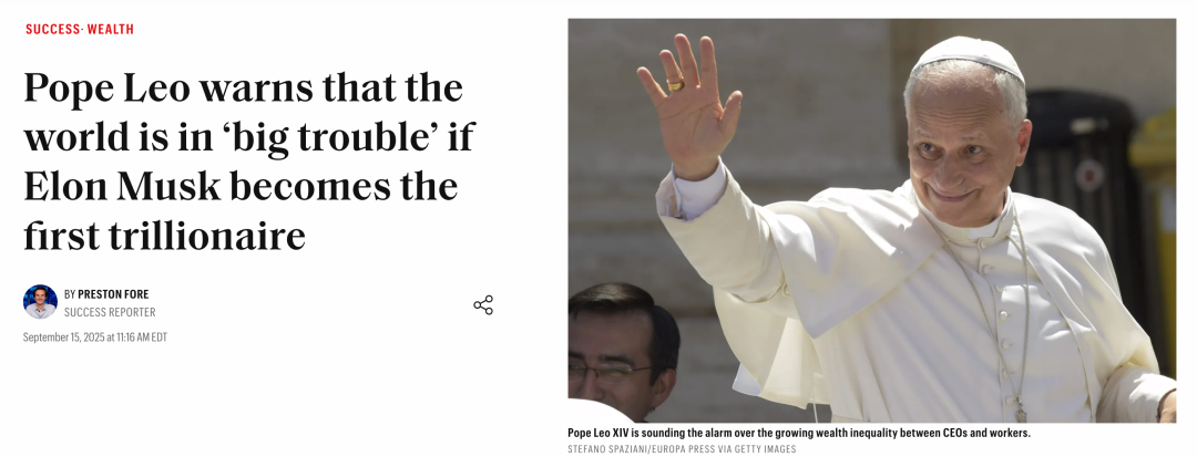 教宗列奥十四世虽然并非特斯拉的投资者,但也最近对马斯克成为万亿富翁所传达的信息以及贫富差距日益扩大的问题表示关切。