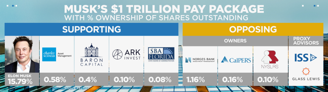 挪威主权财富基金,也是特斯拉的第七大股东,所持特斯拉股份约 1.16%–1.17%,投出了反对票。