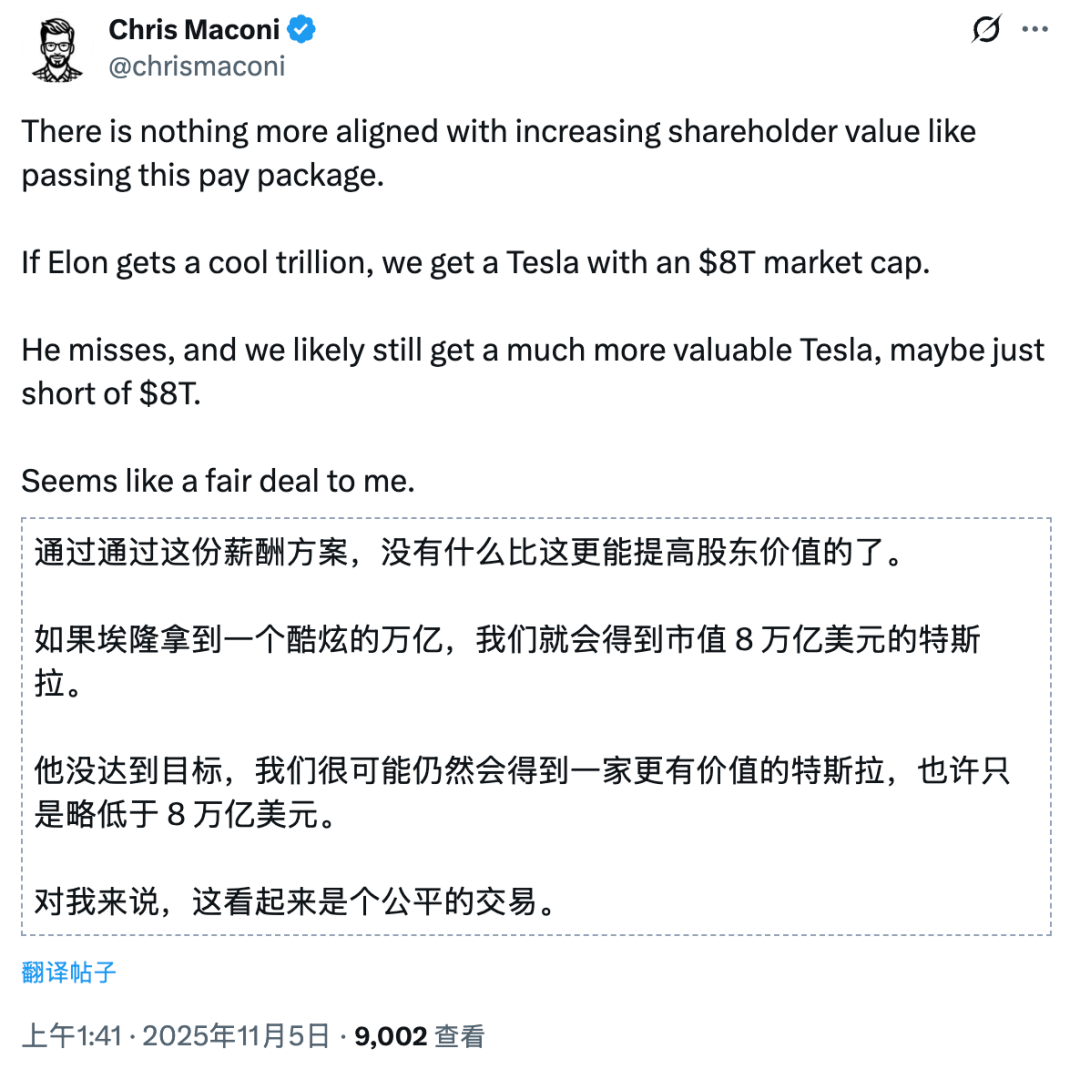 相信马斯克能够带领人类飞出地球,相信给马斯克万亿薪酬,给他实际控制权,他会给人类带来不一样。