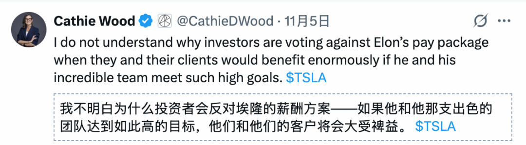 木头姐长期以来一直是马斯克在华尔街忠实的朋友,她认为这些薪酬仅仅是对马斯克创新的奖励而非过度报酬。