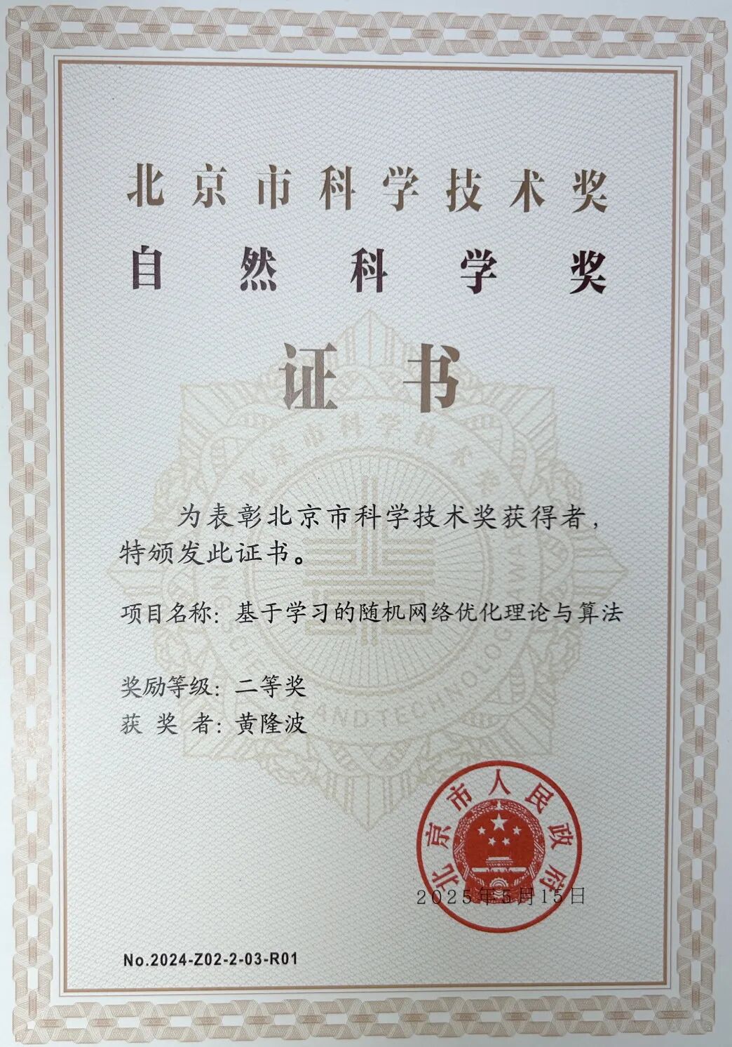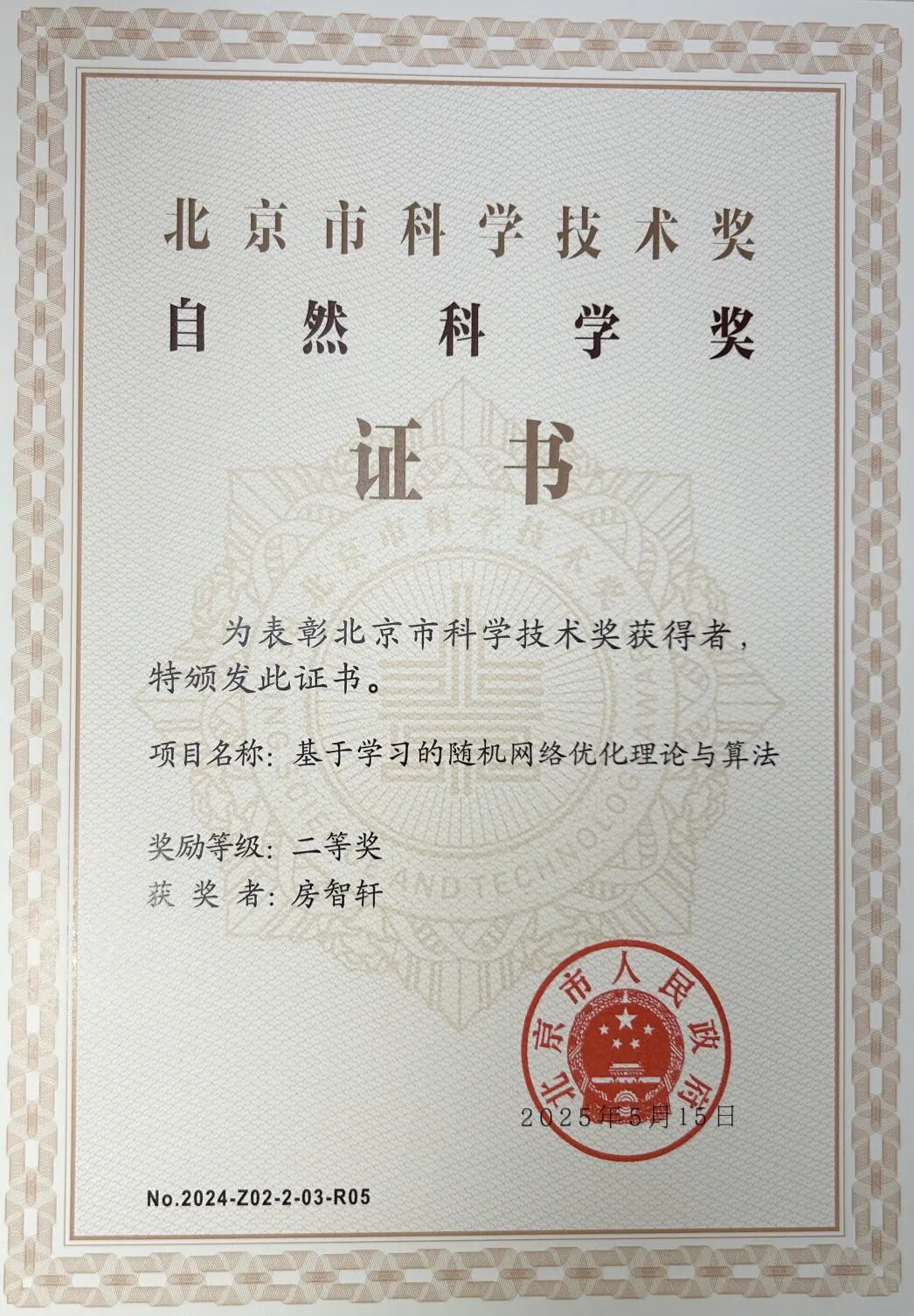 11月7日上午,2024年度北京市科学技术奖励大会召开。由清华大学交叉信息院黄隆波教授牵头、房智轩助理教授参与完成的“基于学习的随机网络优化理论与算法”荣获北京市科学技术奖(自然科学奖)二等奖。获奖成员还包括:香港中文大学教授吕自成、香港城市大学教授陈名华、香港科技大学助理教授潘玲。