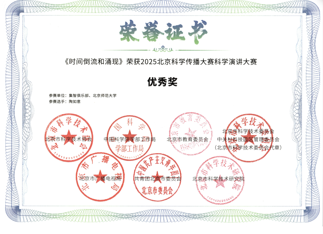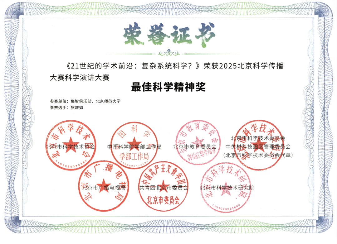 作为一场兼具专业性与创新性的科普盛会,大赛自 2025 年 4 月启动以来,吸引了来自科研机构、高校、企业及科普爱好者的广泛参与。经过多轮筛选与现场终评,9 月初,北京市科学技术协会正式公布获奖名单。集智俱乐部与北京师范大学系统科学学院联合团队报送的科学演讲作品,因主题鲜明、逻辑严谨、表达生动,既展现了深厚的科学素养,又传递了求真务实的科学精神,得到评审委员会的高度认可,最终脱颖而出,一举拿下 “最佳科学精神奖” 和 “优秀奖” 两项殊荣。