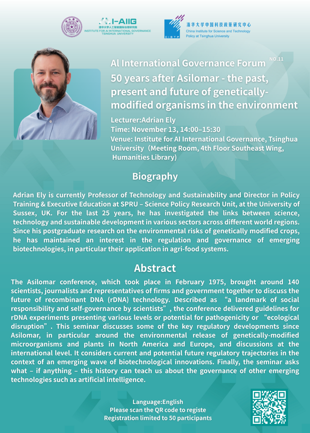 1975 年 2 月召开的阿西洛马会议汇集了约 140 名科学家、记者以及企业和政府代表,围绕重组 DNA(rDNA)技术的未来展开讨论。该会议被称为“科学家承担社会责任与自我治理的里程碑”,并制定了针对不同致病性或“生态破坏”潜在风险等级的 rDNA 实验指南。本次研讨会将回顾自阿西洛马会议以来在监管领域的一些关键发展,特别是北美和欧洲关于转基因微生物与植物环境释放的监管演进,以及相关的国际讨论。同时,将在新一轮生物技术创新浪潮兴起的背景下,考察当前与未来可能的监管路径。最后,本次研讨会将探讨:这一历史究竟能为人工智能等其他新兴技术的治理提供怎样的启示Adrian Ely 现任英国萨塞克斯大学科学政策研究所(SPRU)技术与可持续发展教授,并兼任政策培训与高管教育主任。在过去 25 年中,他围绕科学、技术与可持续发展之间的关系,在全球不同地区的多个领域开展研究。自攻读研究生期间从事转基因作物环境风险研究以来,他始终关注新兴生物技术的监管与治理,尤其是其在农业与食品体系中的应用。