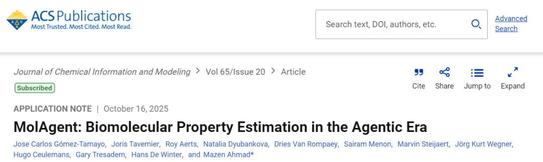 针对上述问题,安特卫普大学、Open Analytics以及强生公司的研究团队于2025年10月16日在《Journal of Chemical Information and Modeling》上发表文章,题为“MolAgent: Biomolecular Property Estimation in the Agentic Era”。